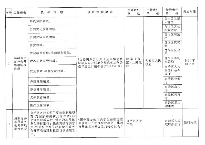 2020年底前,对照国务院有关部门制定的26个试点领域标准指引,依法依规编制完成符合本地区实际、能够反映基层政府职责权限、符合深化“放管服”改革和优化营商环境要求的基层政府政务公开事项标准目录,建立本地区政务公开事项标准目录动态调整和权威公布机制。