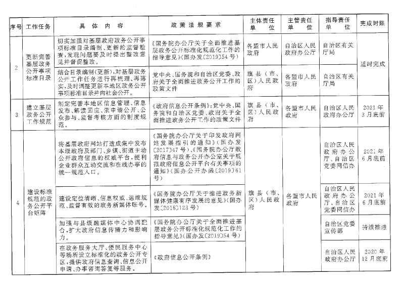 (二)更新完善基层政务公开事项标准目录。自治区各相关部门要按照职能职责,对国家部委在其他领域(26个试点领域以外)制定的基层政务公开标准指引提出贯彻落实意见,督促指导基层政府做好政务公开事项梳理和标准目录编制工作。原则上自治区各相关部门要在国家有关部委印发其他领域新的基层政务公开标准指引后20个工作日内,向基层政府提出更新完善政务公开事项标准目录的建议。各盟行政公署、市人民政府要切实加强对基层政府政务公开事项标准目录编制、更新的监督检查,发现问题要及时提出整改意见并督促整改。基层政府应当建立政务公开事项标准目录动态管理机制,及时调整更新本地区政务公开事项标准目录并向社会公开。