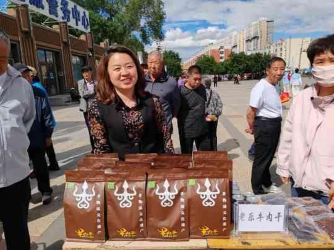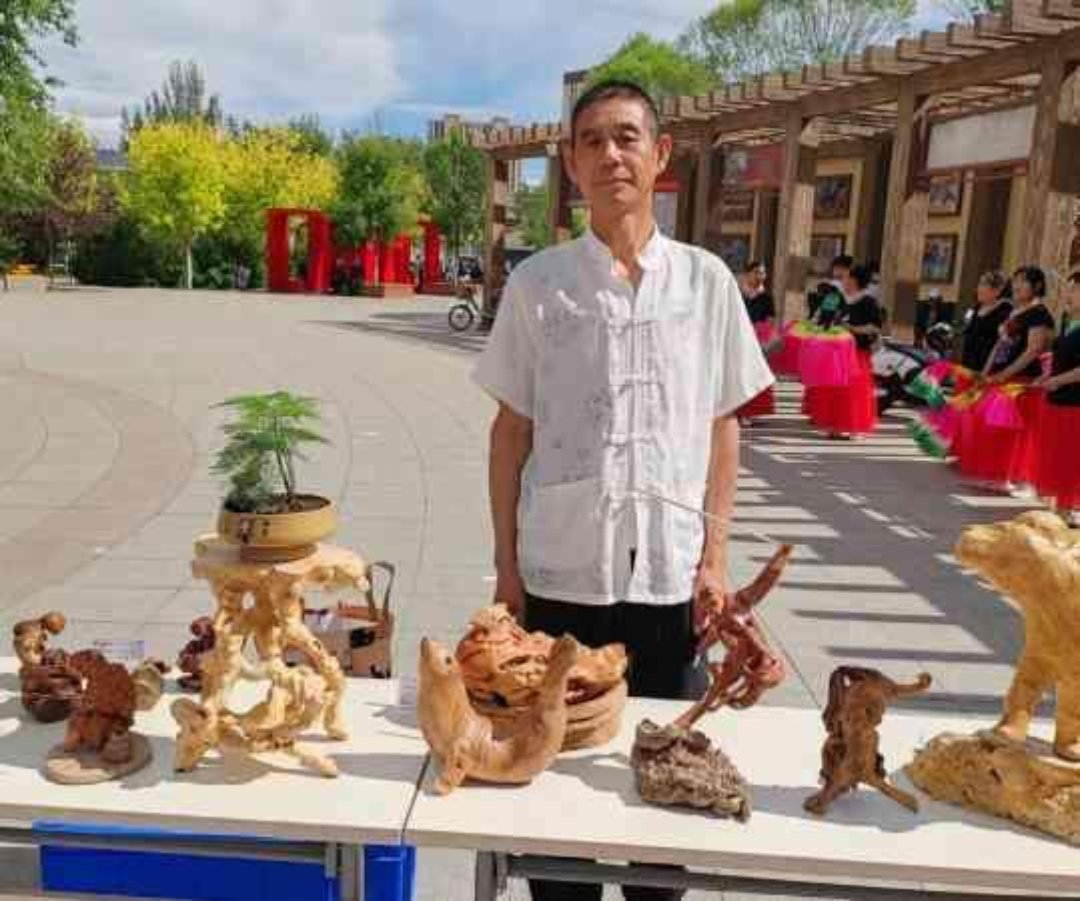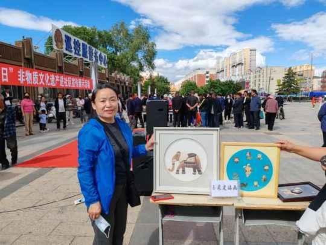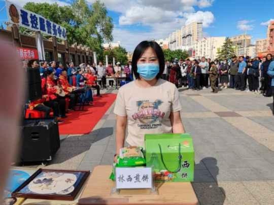 广场两侧展出的玉米皮粘贴画、根雕、老乐牛肉干、林西煎饼等非遗展品,也吸引了不少居民驻足观看。