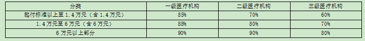 报销比例:政策范围内起付线至1.4万元按照70%,1.4万元至6万元按照80%,6万元以上按照90%比例报销。透析治疗不设起付线,政策范围内金额85%报销。