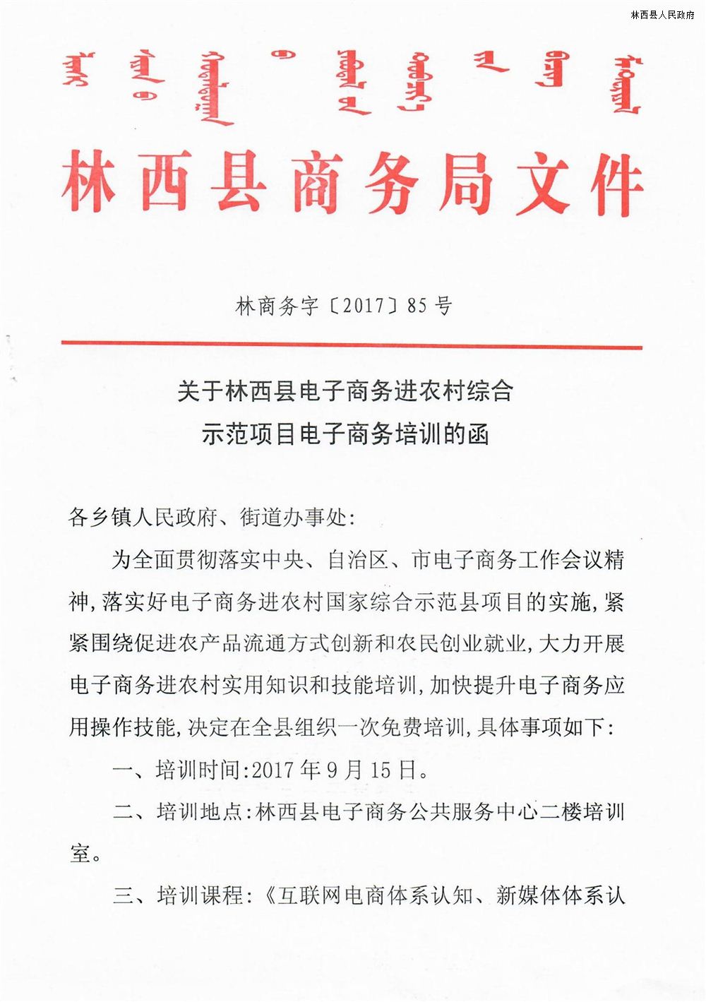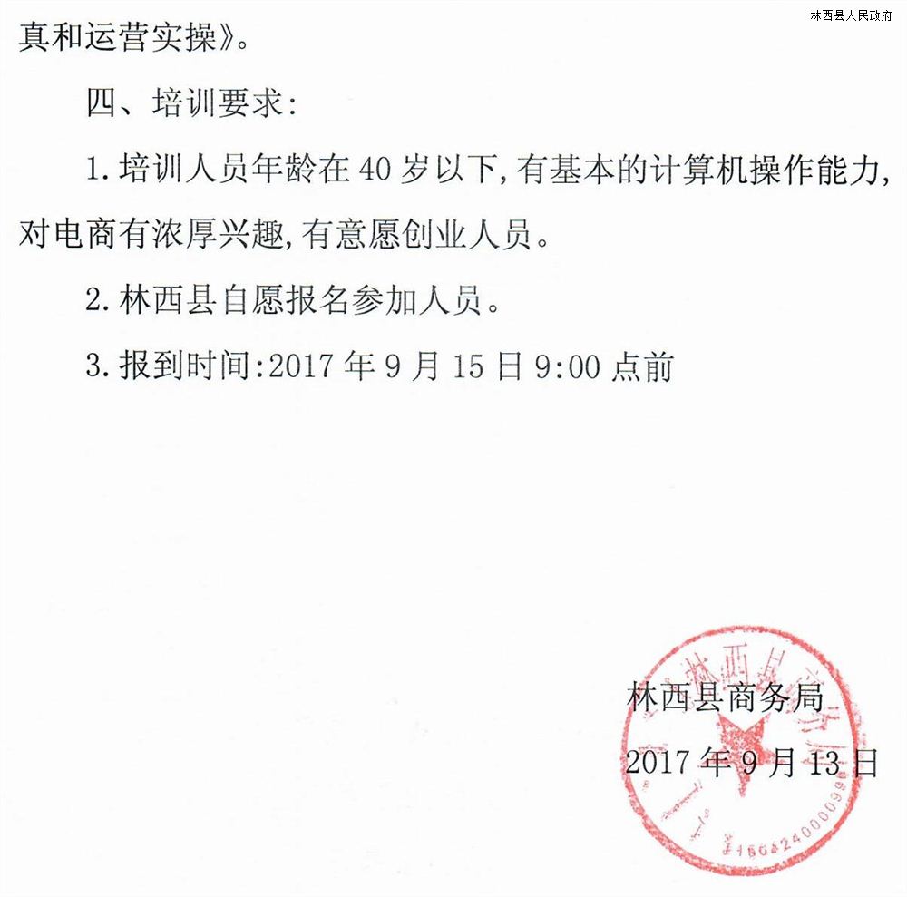 关于林西县电子商务进农村综合示范项目创业培训的函