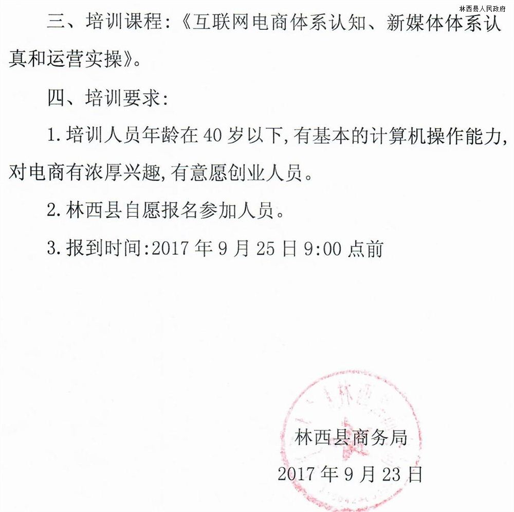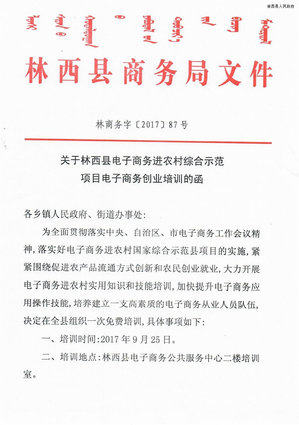关于林西县电子商务进农村综合示范项目创业培训的函