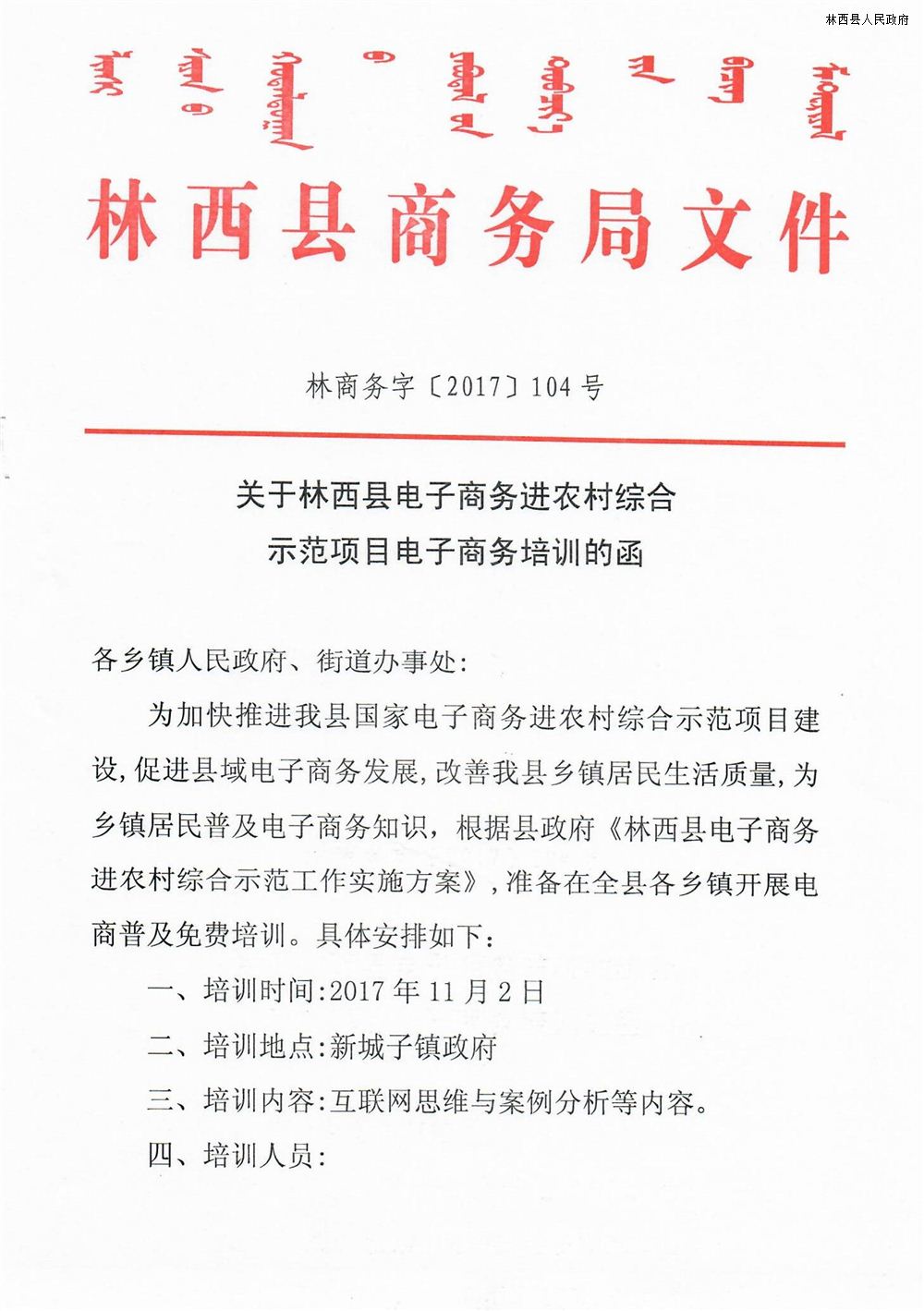 关于林西县电子商务进农村综合示范项目创业培训的函