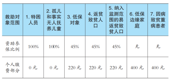 特困人员、孤儿和事实无人抚养儿童个人缴费全额资助;低保对象、返贫致贫人口、纳入监测范围的农村牧区易返贫致贫人口定额资助标准为当期城乡居民医保个人缴费标准的45%;困难群众具有多重特殊身份属性的按“就高不就低”的原则享受参保资助,不得重复资助。资助参保待遇“免申即享”。对全额资助参保的困难群众直接免征代缴,对差额征缴的困难群众直接缴纳个人缴费部分。困难群众待医保部门完成身份信息核定后,即可享受资助参保待遇。以2026年个人缴费金额400元为例,个人缴费标准如下: