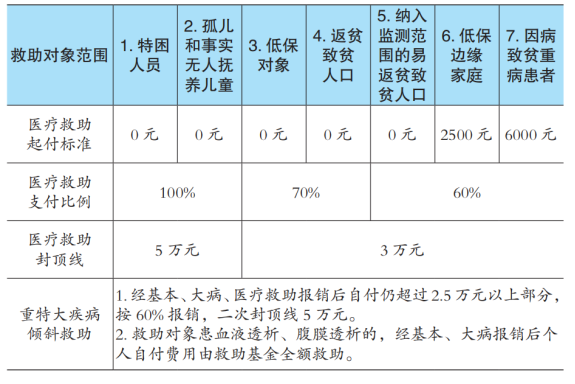 门诊慢性疾病救助不设置起付标准。门诊特殊疾病和住院救助起付标准:特困人员、孤儿和事实无人抚养儿童、低保对象、返贫致贫人口和纳入监测范围的农村牧区易返贫致贫人口救助不设起付标准;低保边缘家庭成员起付标准为2500元,因病致贫重病患者起付标准为6000元。