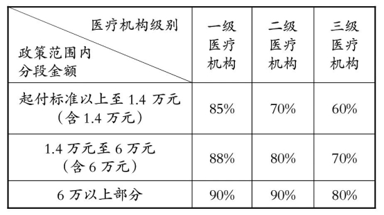 参保人员一个年度内首次在自治区内定点医疗机构住院,基本医疗保险统筹基金起付标准,一、二、三级定点医疗机构分别为200元、600元、1000元,第二次及以上住院起付标准减半。城乡居民基本医疗保险住院医疗费年度最高支付限额为实际支付12万元。各段报销比例如下: