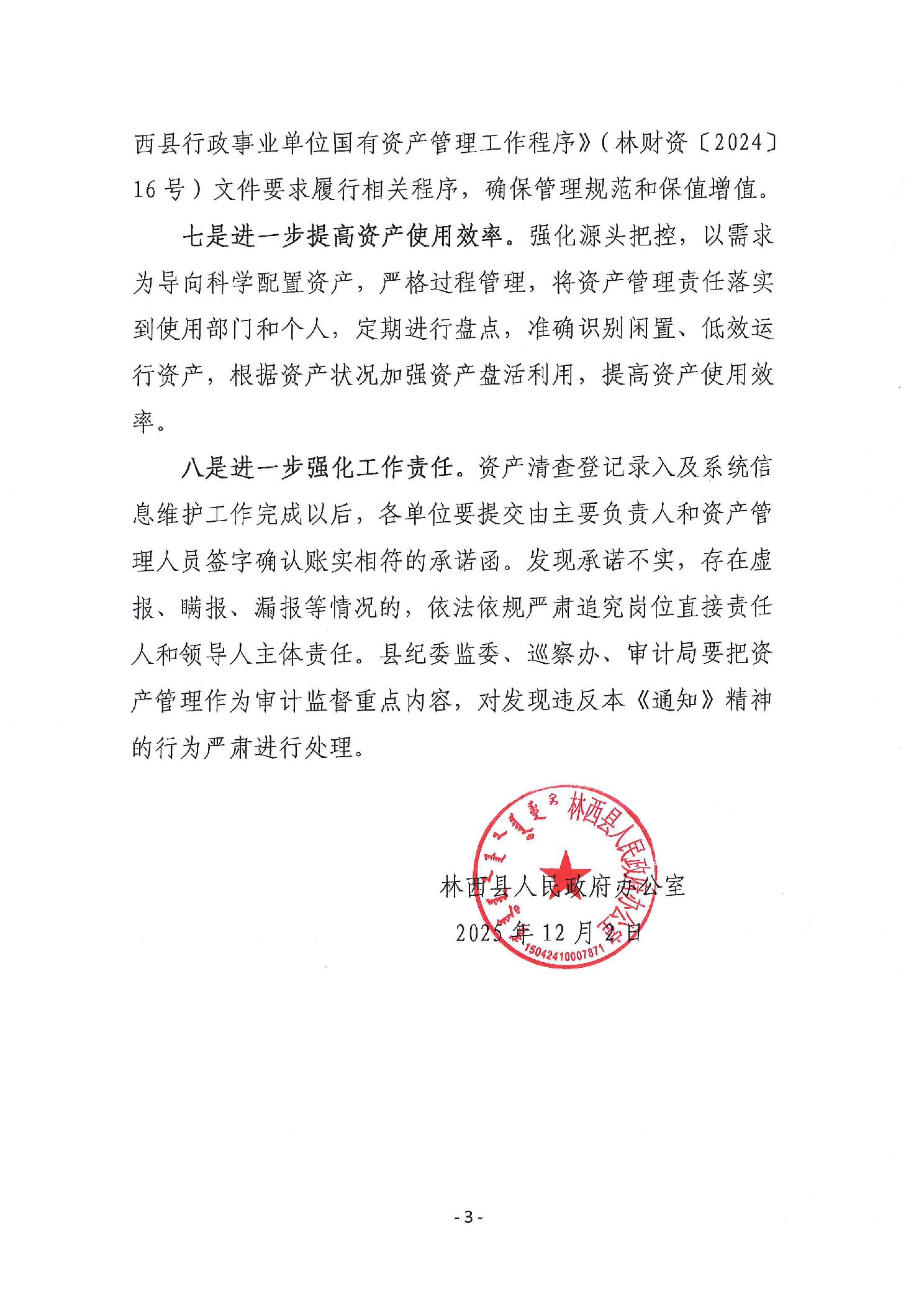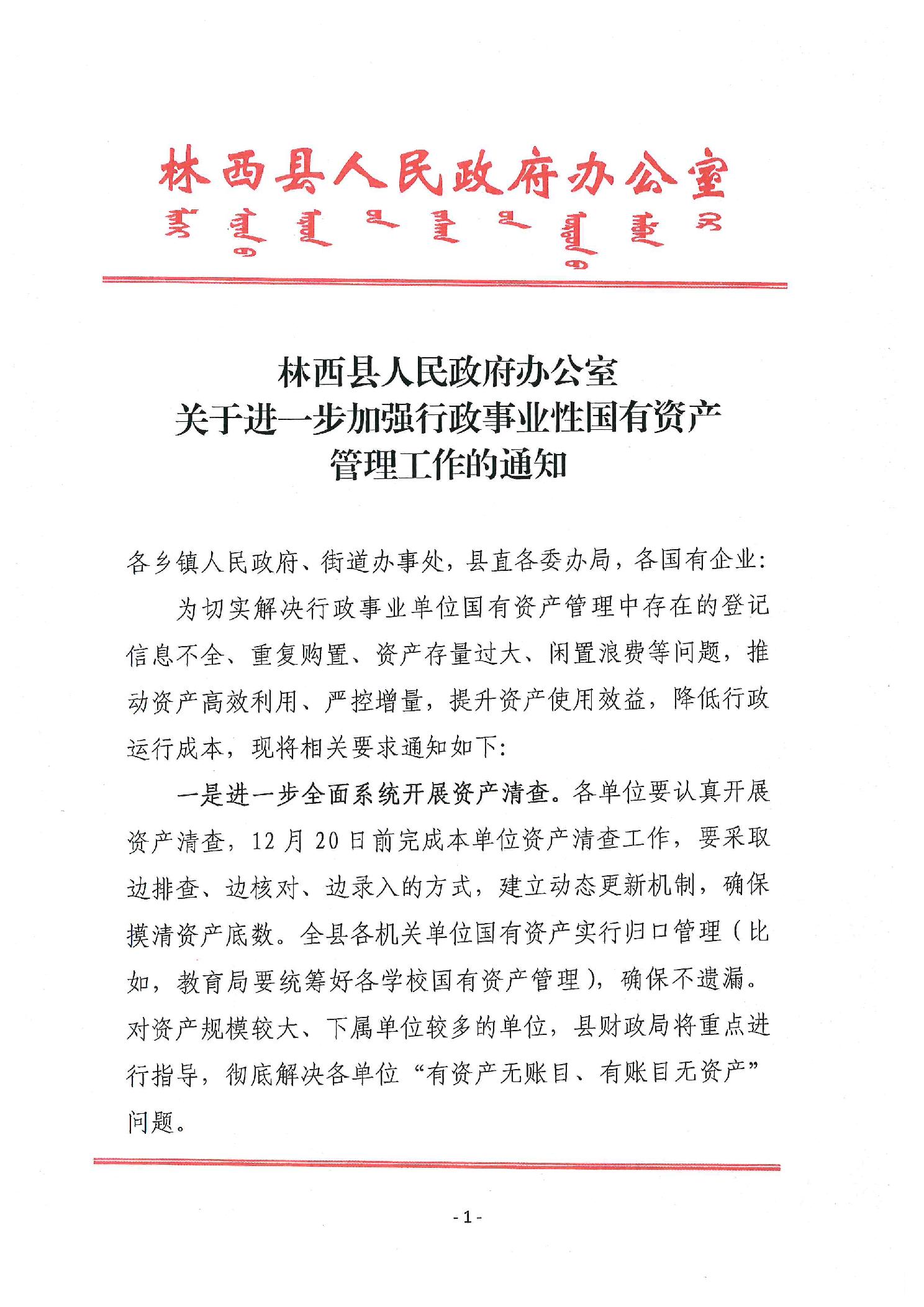 林西县人民政府关于进一步加强行政事业性国有资产管理工作的通知