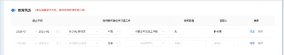 “教育简历”默认至少录入一条,请从最后学历开始填起,可点击“增加”按钮来补充其他经历,需要填至小学教育。若所在旗县区找不到学校信息,请在旗县区最下方选择区内其他学校或区外其他学校,输入学校名称即可。