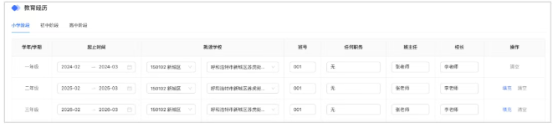 基本信息中,填报“本人户籍是否从自治区外迁入”为“是”或“是否是自治区外来务工人员随迁子女”为“是”的考生,需要录入“教育经历”信息。填报“教育经历”时系统支持快捷填充与清空操作,填充行和上一行内容保持一致,且支持修改。其中“起止时间”不进行自动填充。