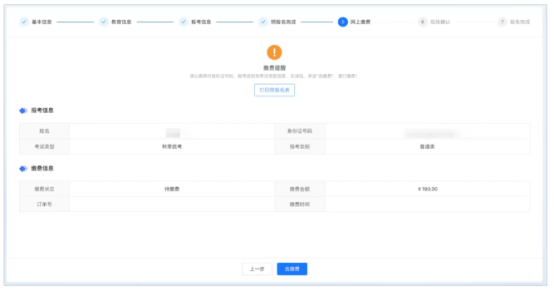 第五步缴纳考试报名费用,考生须仔细核对报考信息及缴费金额信息。核对无误后点击“去缴费”按钮,