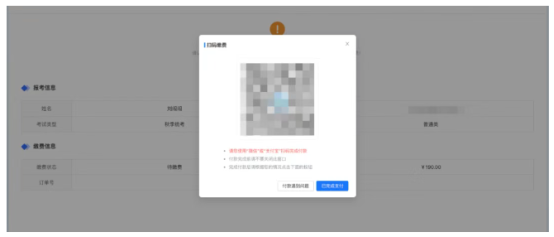 使用“微信”或者“支付宝”扫描页面弹出的缴费二维码并进行费用缴纳,缴纳完成后,点击“已完成支付”按钮。