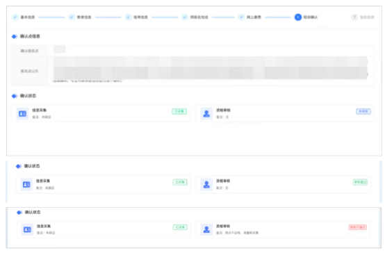 报名系统中会实时显示出考生信息采集状态及报名资格审核状态。若审核不通过,可根据审核给出的不通过理由进行填报信息修改或照片重新采集并再次提交资格审核。