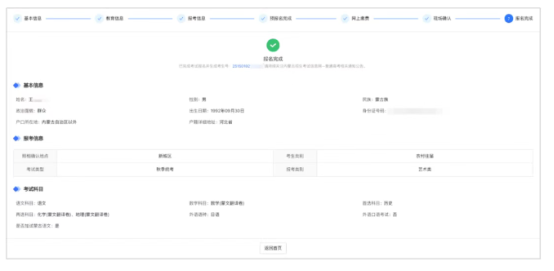 生成考生号即表示报名完成,网上报名系统步骤会自动跳转至第七步报名完成。