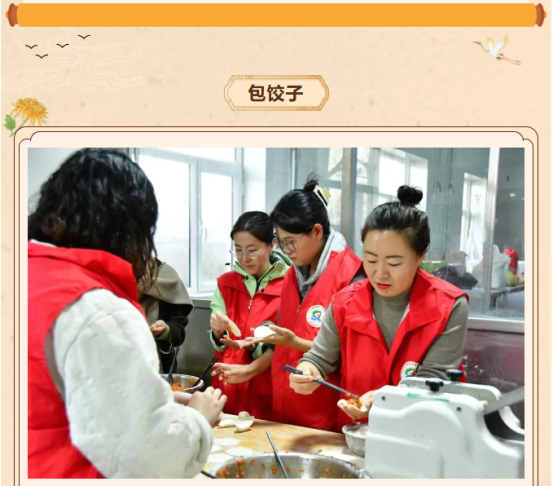 活动现场温馨热闹、暖意融融。党员志愿者们纷纷撸起袖子,投入到包饺子活动当中。有的志愿者手法娴熟,雪白的饺子在手中快速成型;有的志愿者虽不太熟练,却也认真请教、反复尝试,在同伴的指导下逐渐掌握技巧。不一会儿,一个个饱满的饺子就铺满了案板,这些饺子虽然形态各异,却都同样承载着志愿者对老人们的深切关怀与真挚祝福。福和温暖。