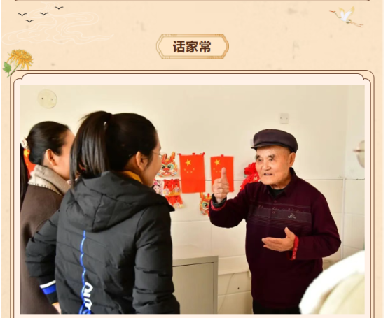活动期间,志愿者们走进老人房间,详细了解他们的身体状况和生活需求,耐心倾听心声,细致讲解党的惠民政策、和老年人权益保障知识,并发放民族团结及民法典宣传品。一句句暖心问候,一次次贴心交流,让老人们深切感受到党的关怀和温暖。“感谢党始终惦记着我们!”一位89岁高龄的退伍老兵激动地说。