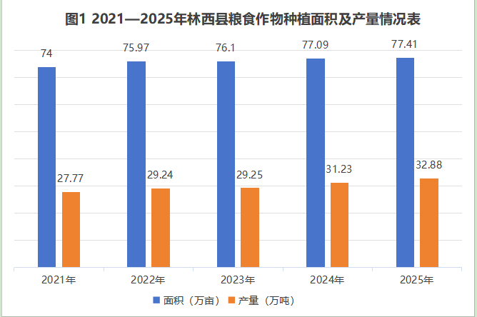 仓廪实,天下安,截至2025年年底,林西县粮食作物种植面积稳定在70万亩以上,产量连续五年保持在27万吨以上,亩产实现“五连增”,2024年产量首次突破30万吨(见图1)。