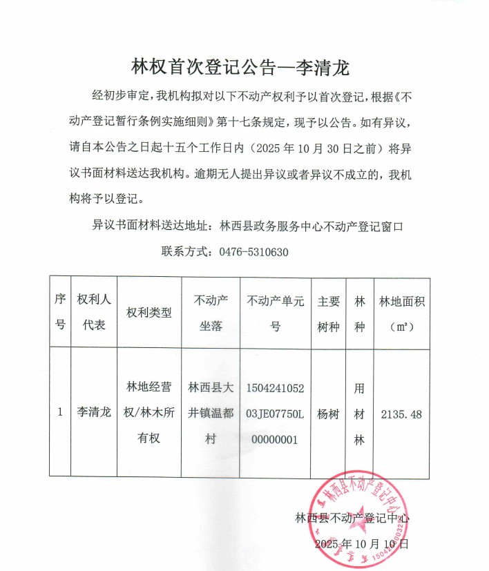 李清龙林权首次公告