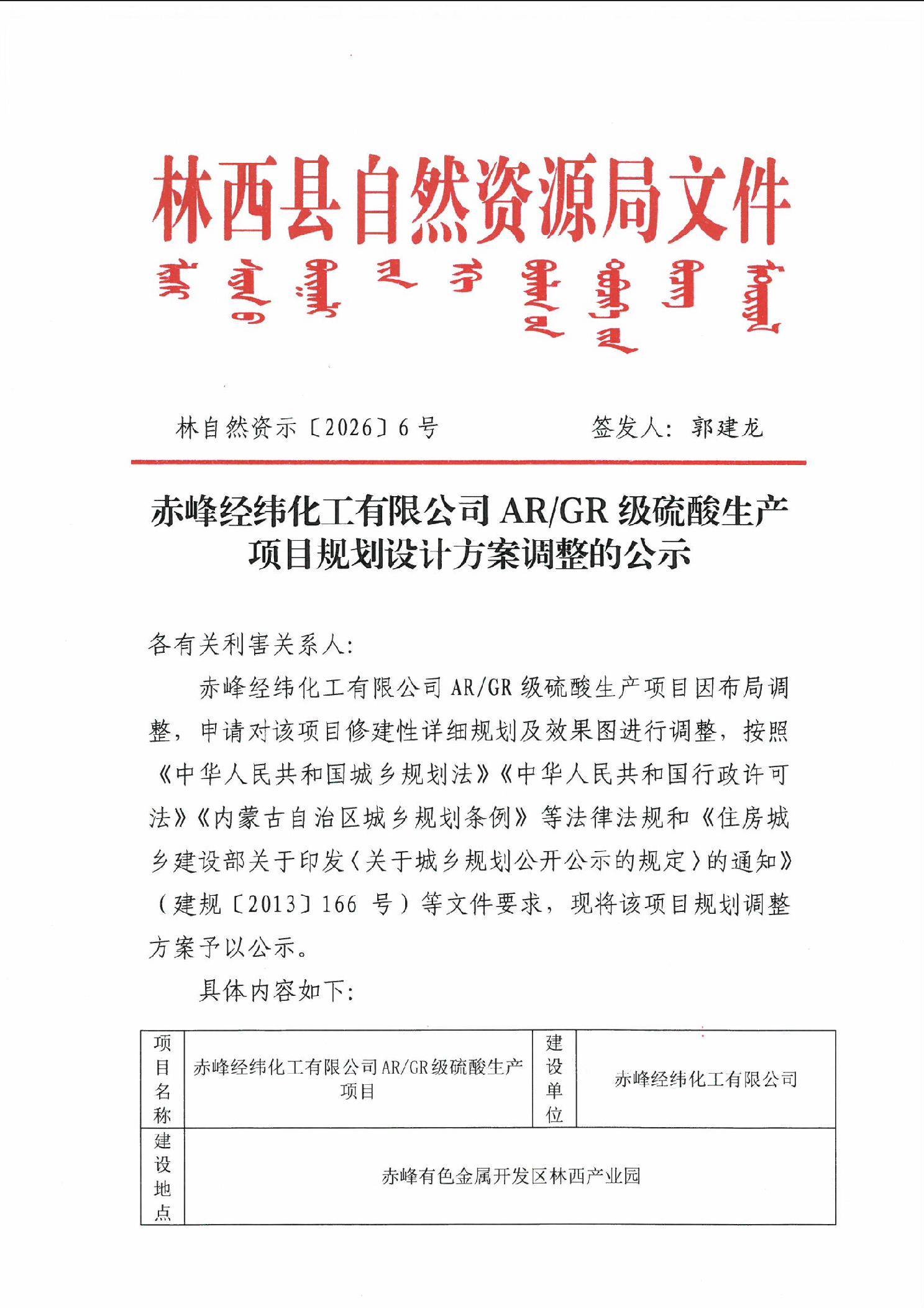 赤峰经纬化工有限公司AR/GR级硫酸生产项目规划设计方案调整的公示