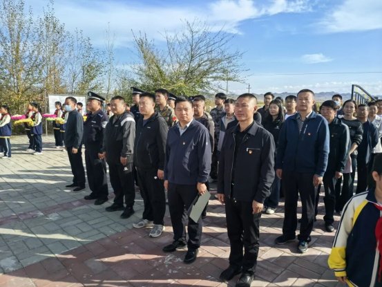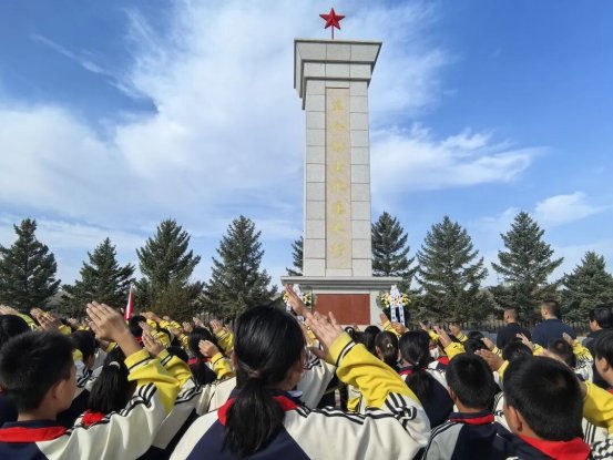 烈士纪念碑前,全场肃立,列队整齐。伴随着高亢的旋律,全体齐声高唱《中华人民共和国国歌》,国歌毕,全场默哀,面向烈士纪念碑三鞠躬,寄寓深切缅怀。