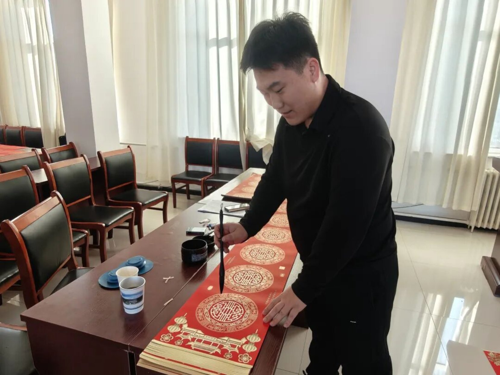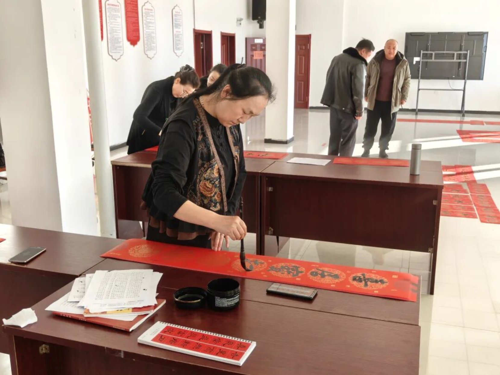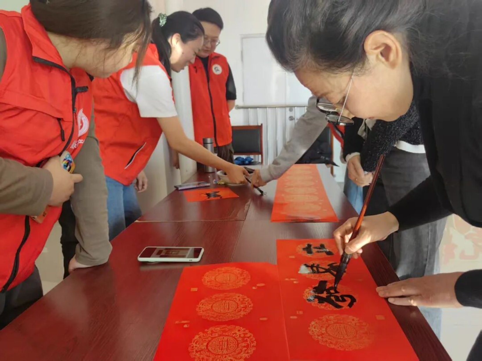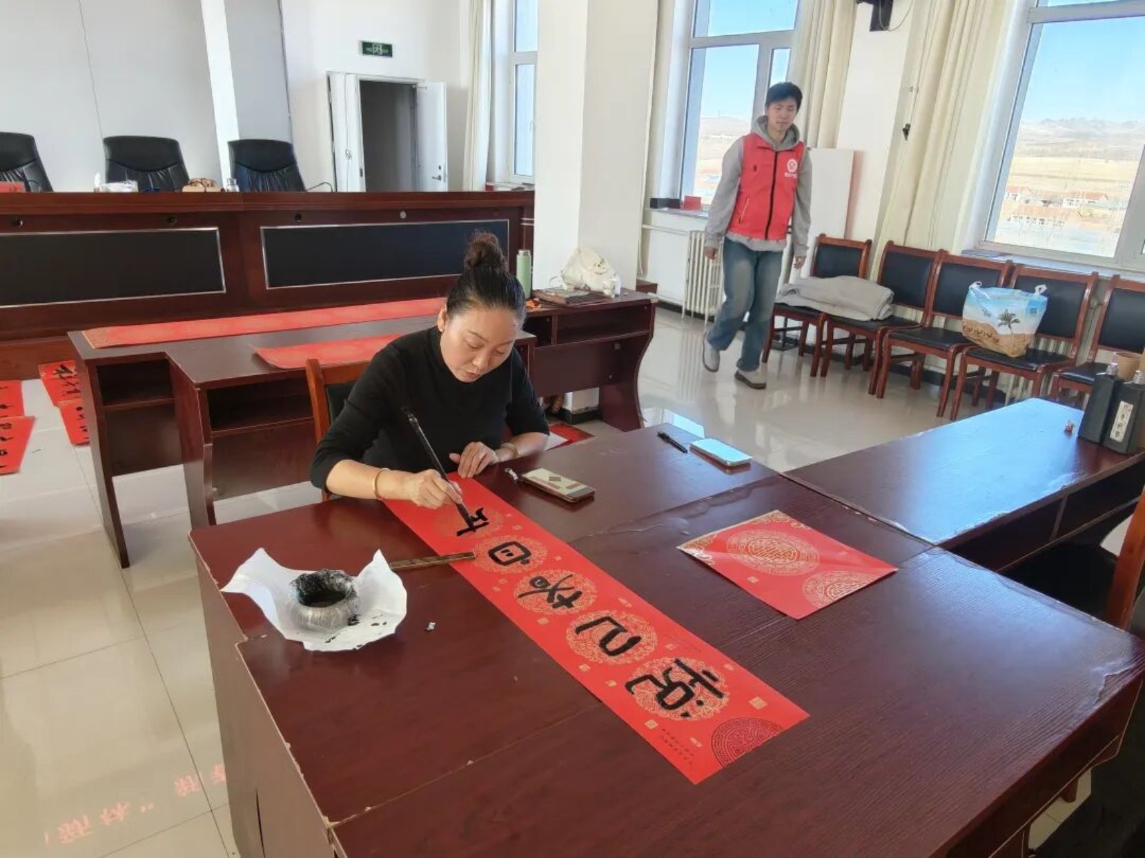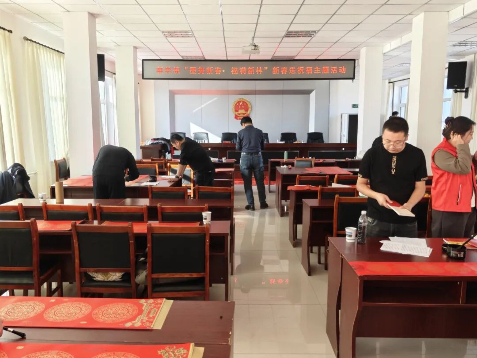 岁聿云暮,春祺将至。2月13日,新林镇新时代文明实践所内墨香萦绕、暖意融融,一场“墨舞新春·福满新林”新春送祝福主题活动热闹启幕。特邀海川书画院的各位书法老师挥毫泼墨,以笔墨为媒、以春联为礼,为全镇群众送上满含年味与期许的新春祝福,让丙午马年的喜庆氛围在红笺朱墨间悄然蔓延。