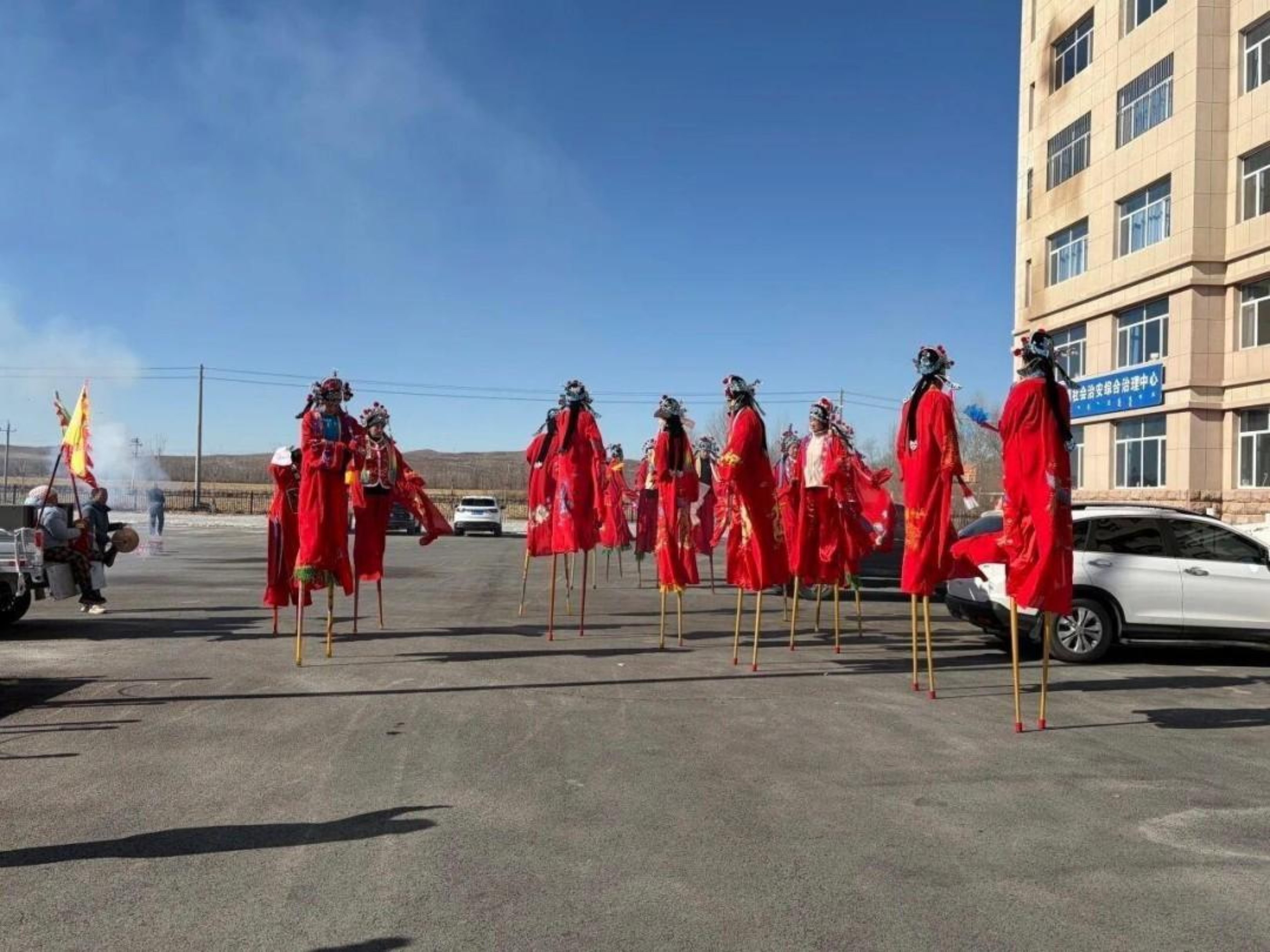 镇政府广场上锣鼓喧天、喜气洋洋,各村秧歌队齐聚一堂、同台献艺。队员们脚踏高跷,身着色彩鲜艳的传统服饰,手持彩扇红绸,踏着铿锵鼓点翩然起舞,舒展的身段、灵动的舞步、整齐的队形,将民间秧歌的质朴热烈展现得淋漓尽致。围观群众掌声不断、欢声笑语此起彼伏,处处洋溢着团圆和睦、喜庆热烈的节日气息。